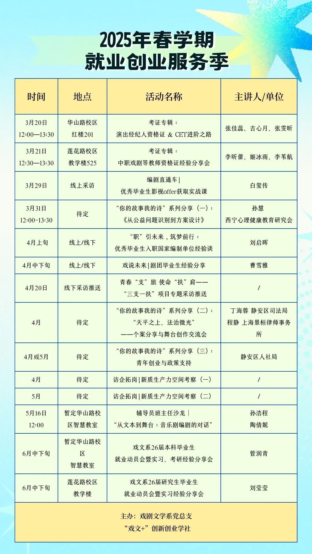 随着春意渐浓,由戏剧文学系党总支主办,戏剧文学系研究生会、学生会,“戏文+”创新创业学社承办的2025春季学期戏文系就业创业服务季,又拉开了帷幕。