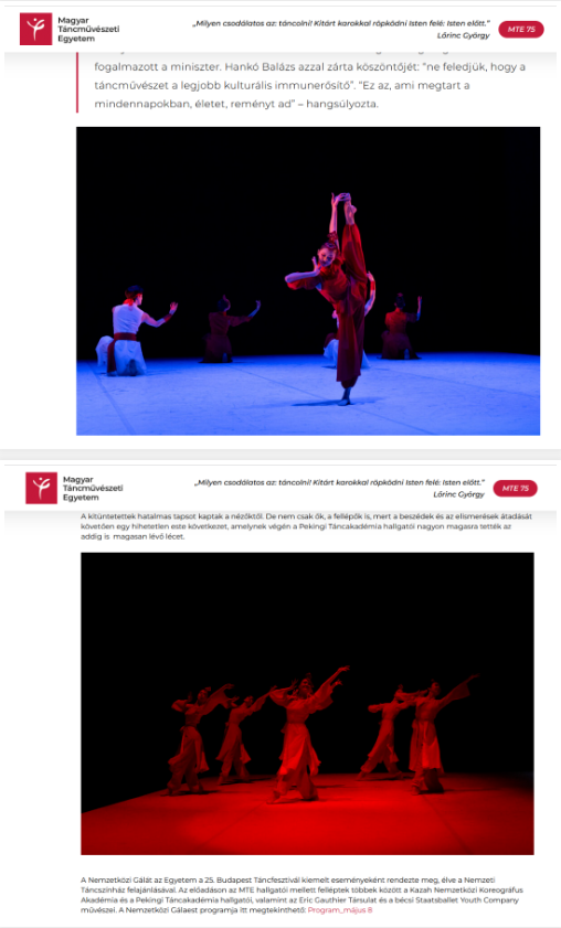 匈牙利舞蹈大学75周年庆典暨第25届布达佩斯国际舞蹈节开幕式汇聚了全球多国顶尖舞团及艺术家,逾130位表演者同台献艺。开幕式上,匈牙利舞蹈大学对于上戏等各国高校及院团的到来表示了热烈的欢迎。匈牙利创新与文化部长Balázs Hankó在致辞中表示“在我们灵魂深处,除了追求至美、至善与和谐这些在艺术与文化中臻于极致的事物,我们别无他求。舞蹈艺术是最佳文化增强剂,它支撑着我们的日常生活,给予我们希望”。