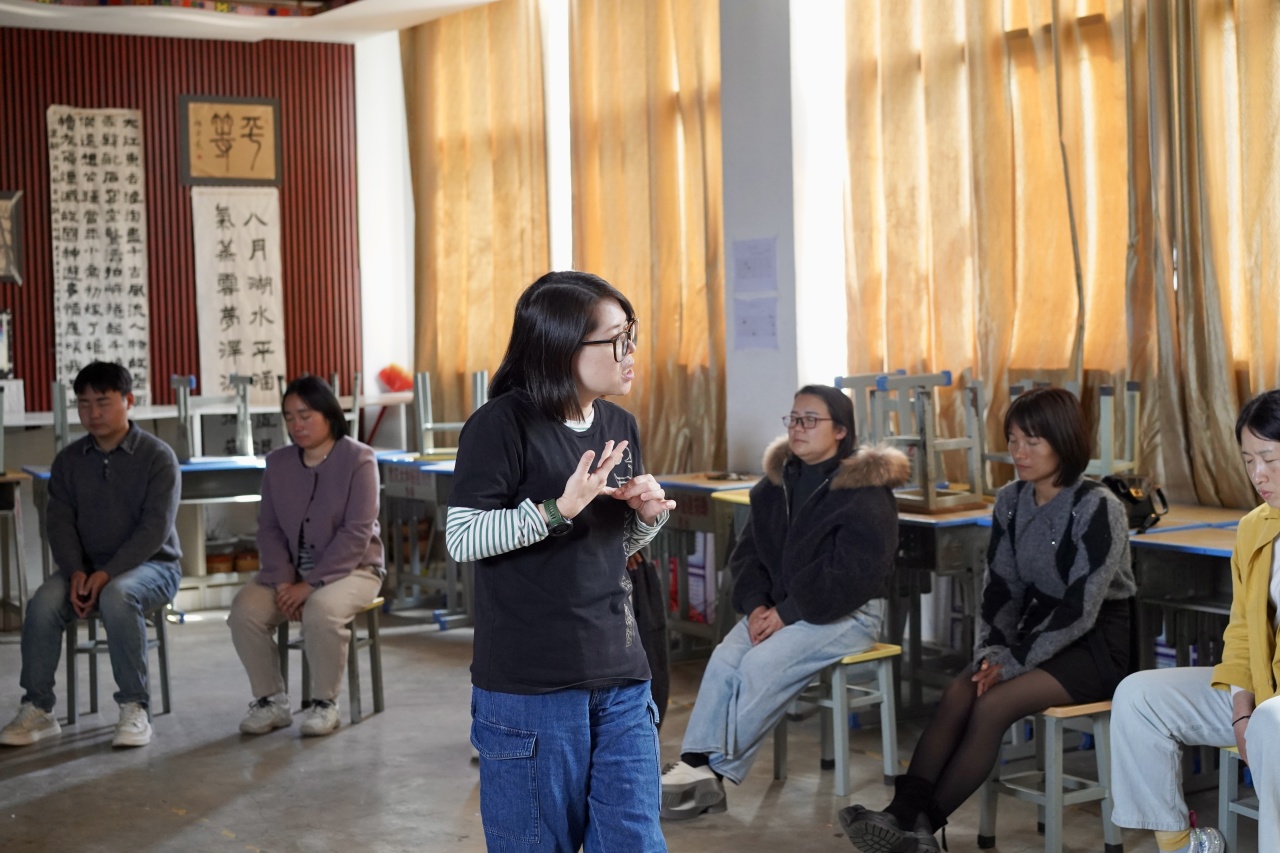 上海戏剧学院博士研究生、昆明城市学院教师王超带来《时间该去哪儿呢?》教育剧场,围绕“师生关系”这一核心议题展开沉浸式探索与共创。在戏剧情境中,与教师们一同重新审视课堂中的师生关系、沟通方式与情感连接,探讨如何在日常教学中建立更具支持性与成长力的师生互动模式。王超还带领当地教师开展古诗剧排演《江村诗情》,充分发挥当地教师能歌善舞的特色,在实践中传递戏剧教学方法。