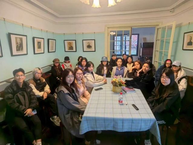 梧桐掩映的老洋房静立在城市的街角,推门而入,时光仿佛悄然放缓。25级戏剧教育专业的学生跟随讲解员穿梭于展厅,细看泛黄的信笺、手稿,先生的美育理念在静默的展陈中渐渐清晰。行至三楼,大家围坐在一起,从所见所感聊到对美育的理解,言谈间不时碰撞出新的思索。这一程,不只走进了一段历史,更在细腻的感知中,触碰到了美育的温度与戏剧的力量。
