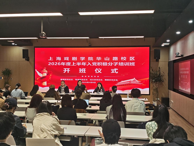为深入学习贯彻习近平新时代中国特色社会主义思想和党的二十大及二十届历次全会精神,严把党员发展关口、提升党员发展质量,扎实做好新时代党员发展工作,表演系(含音乐剧中心)党总支、导演系党总支、戏文系党总支和舞美系党总支联合开展2026年上半年华山路校区(四院系)入党积极分子培训班,本次培训班由导演系党总支轮值承办。导演系党总支书记尹悦蓉、舞美系党总支副书记徐辉、表演系(含音乐剧中心)党总支副书记夏逸石,四院系学生党支部书记、副书记以及35名入党积极分子参加仪式,开班仪式由导演系党总支书记尹悦蓉主持。
